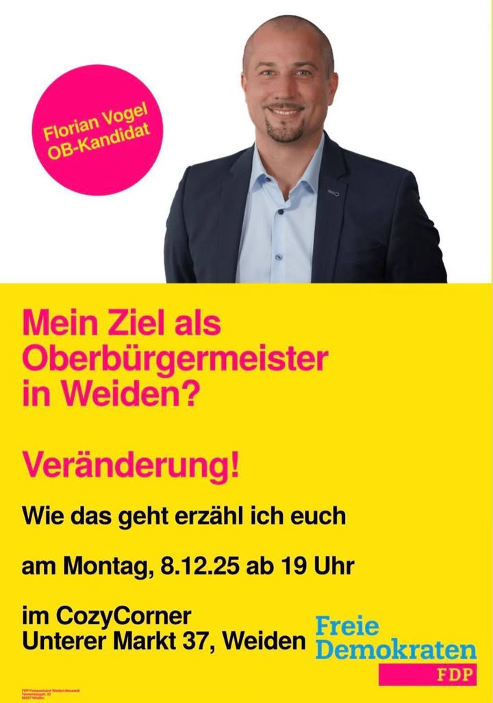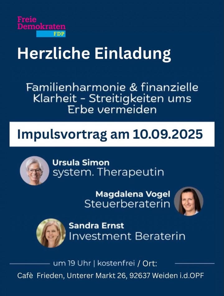Die Veranstaltung findet am Mittwoch, 10. September, um 19 Uhr im Café Frieden, Unterer Markt 26, 92637 Weiden, statt. Die Veranstaltung wird von der FDP Weiden-Neustadt organisiert und ist kostenfrei. Eine Anmeldung ist nicht erforderlich, Interessierte sind willkommen.
